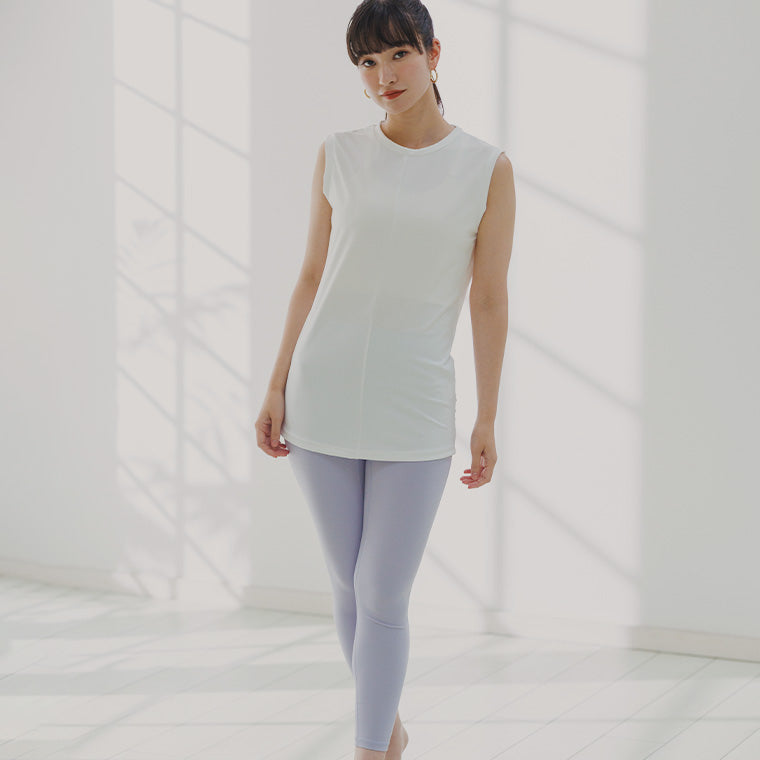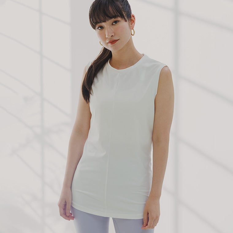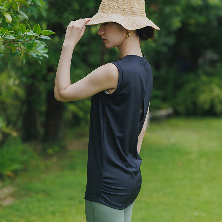 スッキリとシンプルなフロントデザイン。胸元が見えにくい丸首でヘルシーに肌見せできるバックスタイルが印象的です。