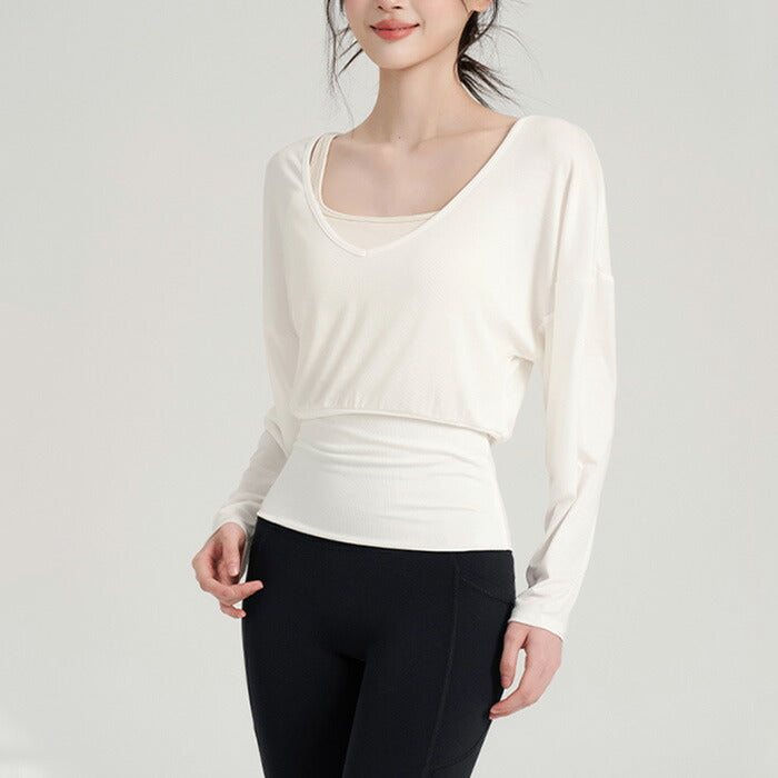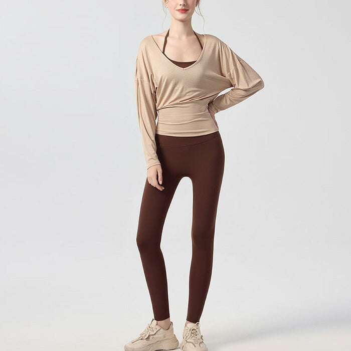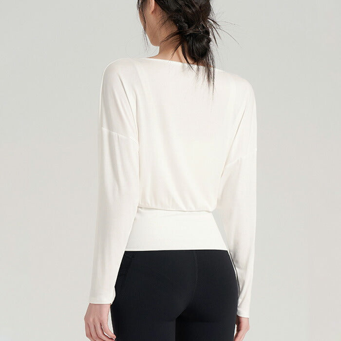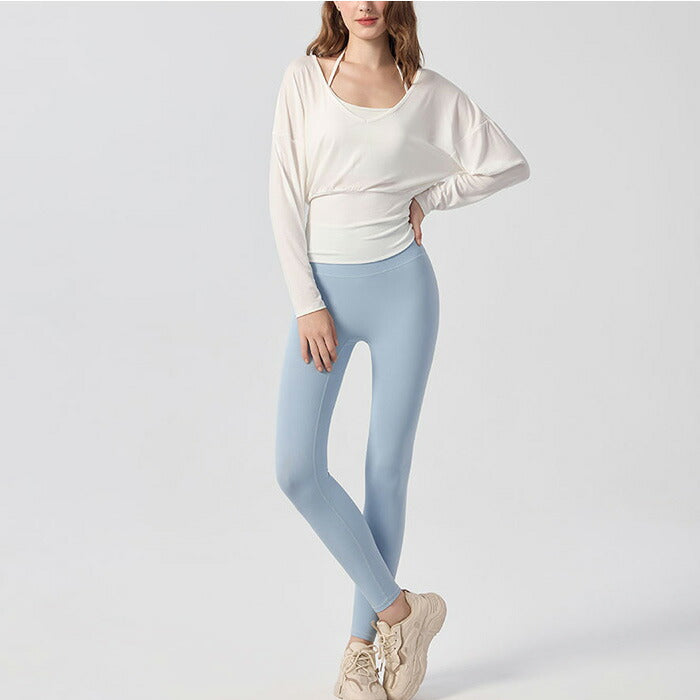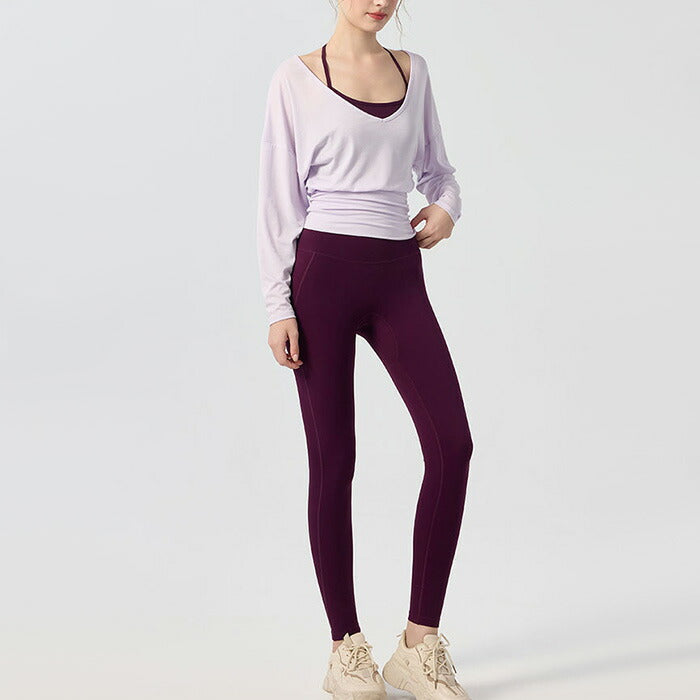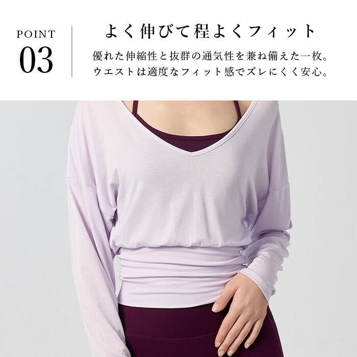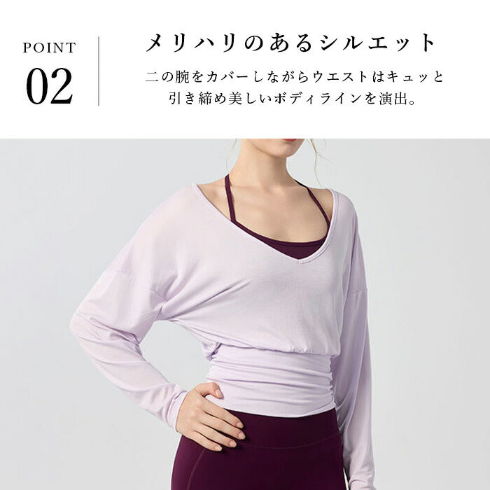 気になる二の腕をしっかりカバー。ウエスト部分は幅広のフィット感で、激しいポーズでも裾がめくれ上がりにくい設計です。