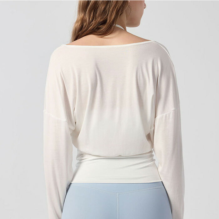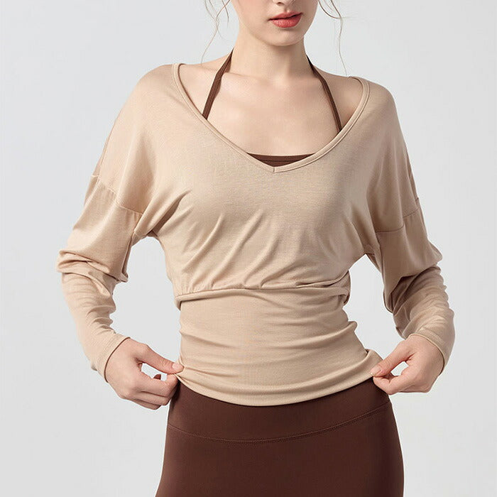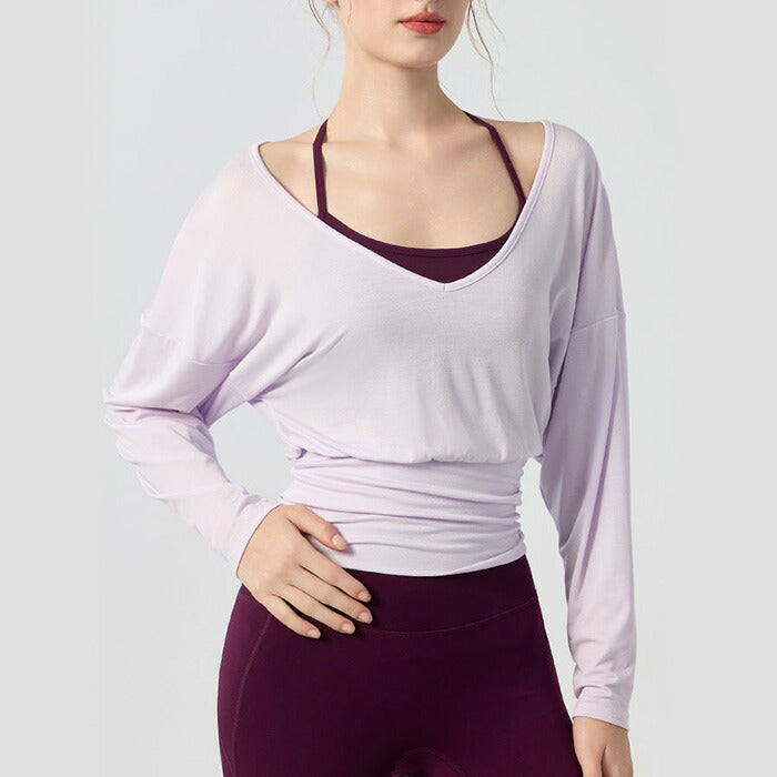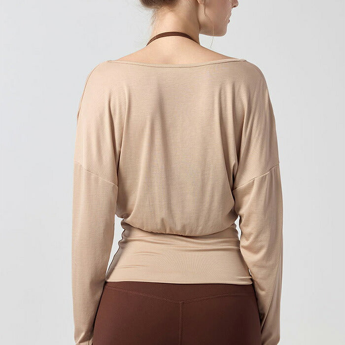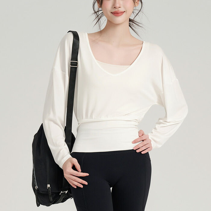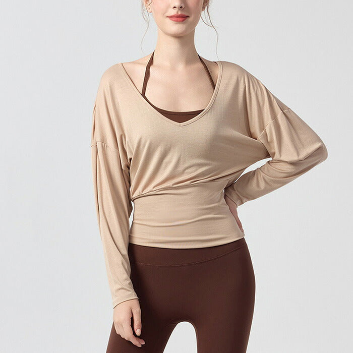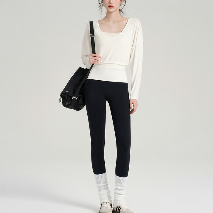 気になる二の腕をしっかりカバー。ウエスト部分は幅広のフィット感で、激しいポーズでも裾がめくれ上がりにくい設計です。