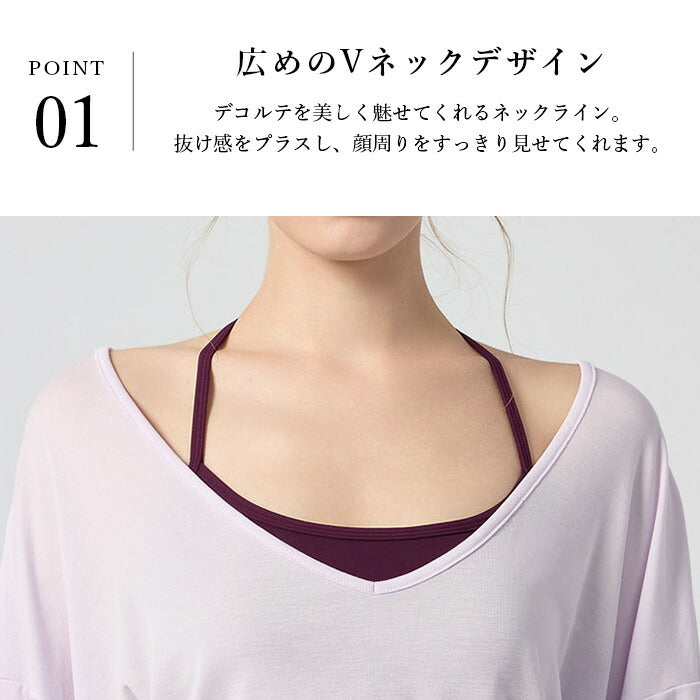 広めに開いたVネックデザインが、デコルテラインを美しく、顔周りをシャープな印象に見せます。