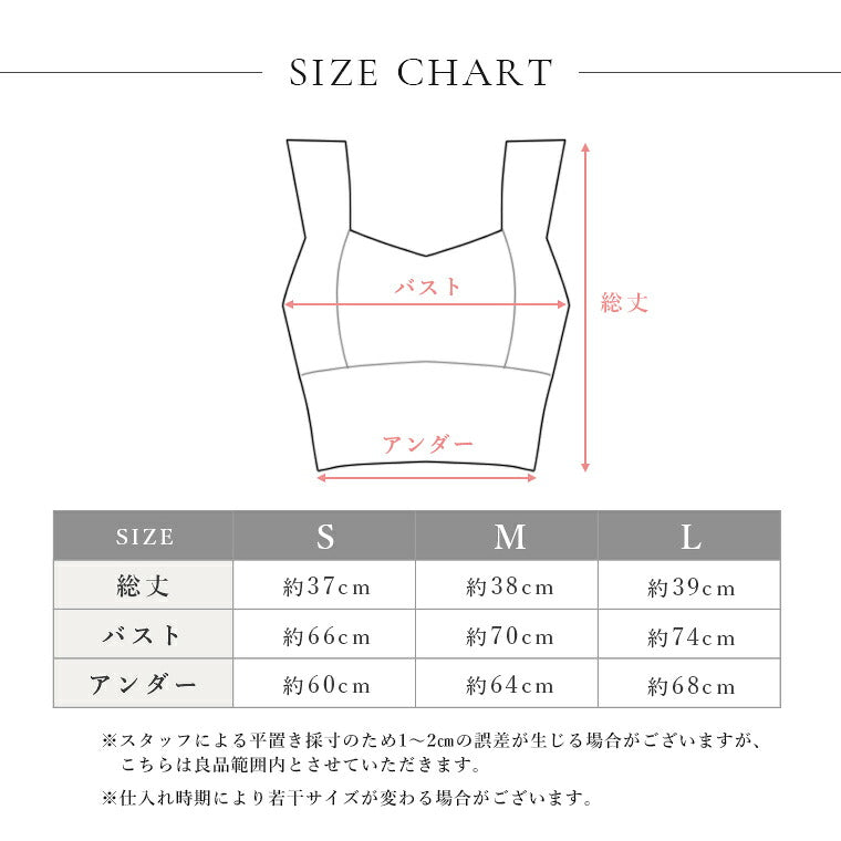 | サイズ | ■総丈 Sサイズ37cm/Mサイズ38cm/Lサイズ39cm/ ■胸囲 Sサイズ66cm/Mサイズ70cm/Lサイズ74cm/ ■アンダー Sサイズ60cm/Mサイズ64cm/Lサイズ68cm/ ※日本での着用サイズと同様で大丈夫です。少しゆとりを持った着用をしたい方は1つ上のサイズをオススメいたします。 サイズや着心地などお困りの方はご相談お待ちしております。 ※サイズは平置きでのサイズとなります。 ※商品・着用者・洗濯後によっては多少の誤差がある場合がございます。 |