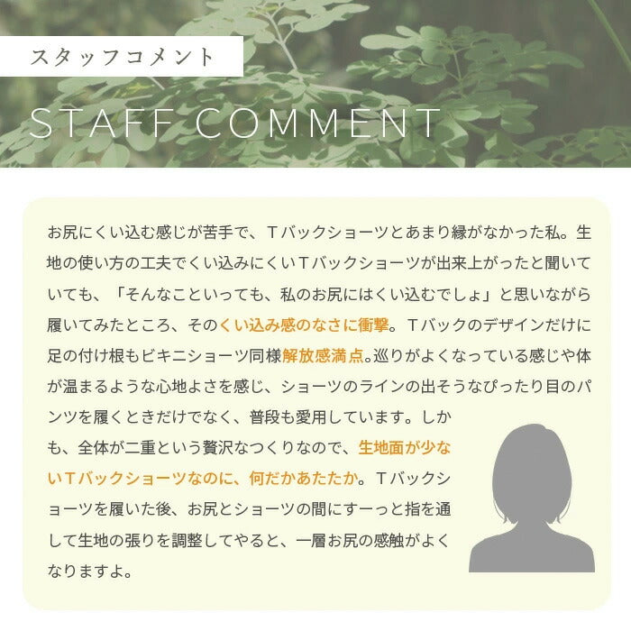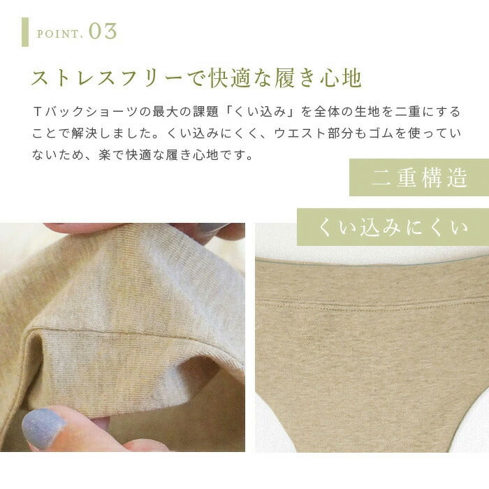 Tバックショーツの最大の課題「くい込み」を全体の生地を二重にすることで解決しました。