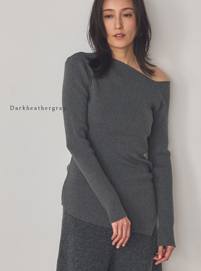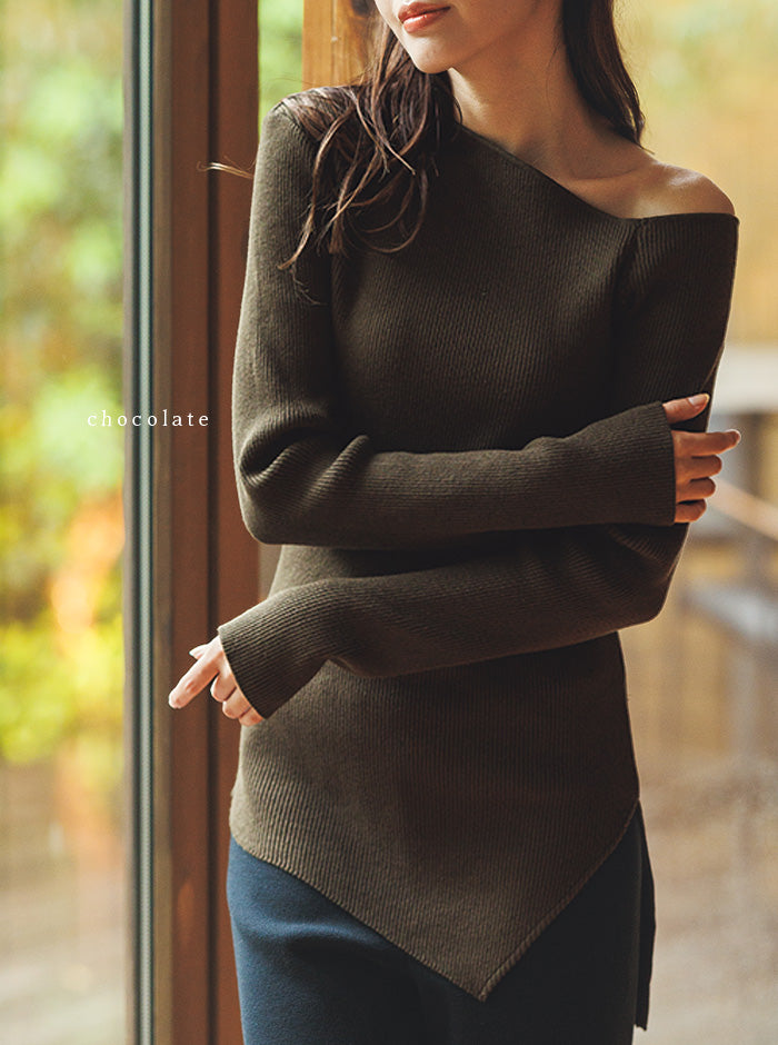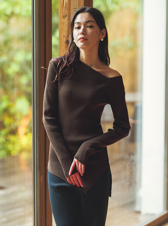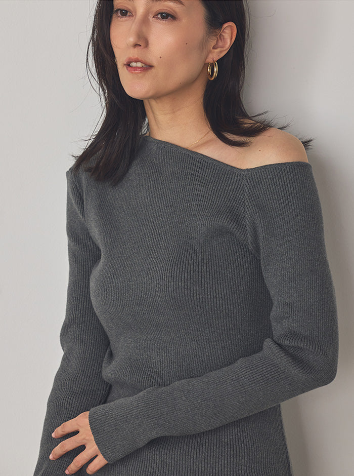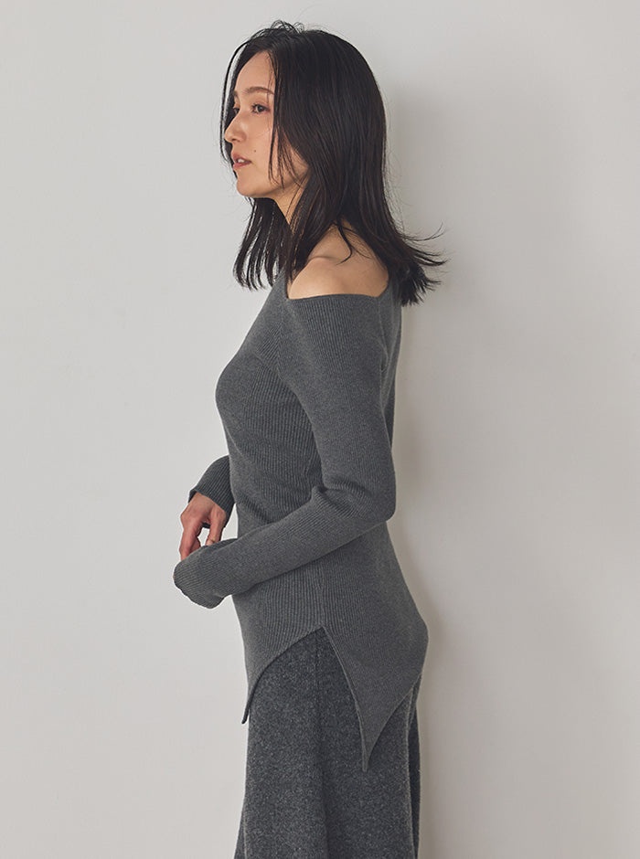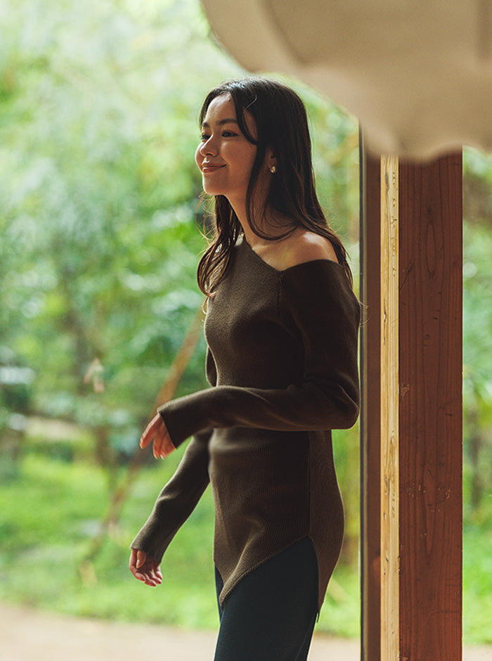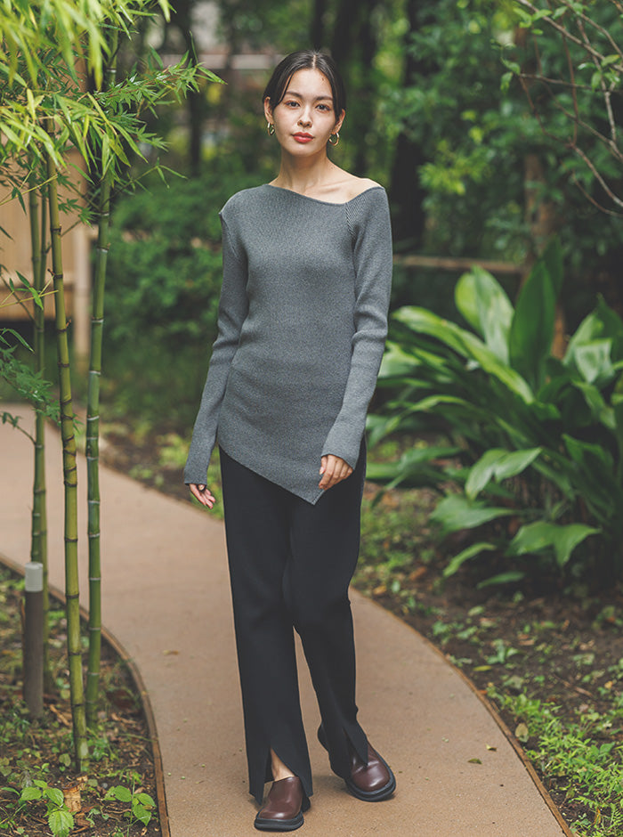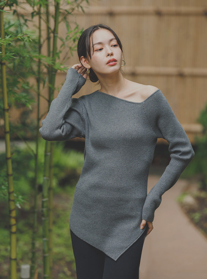 Vネックラインは顔まわりをすっきりと見せ、裾のアシンメトリーデザインは花びらのような動きを感じさせます。