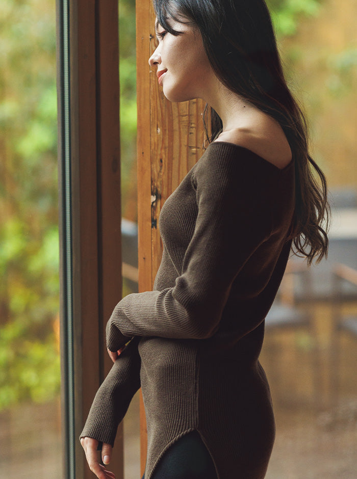 ヒップラインを自然にカバーしつつ、縦のラインを強調するシルエットでスタイルアップを実現。