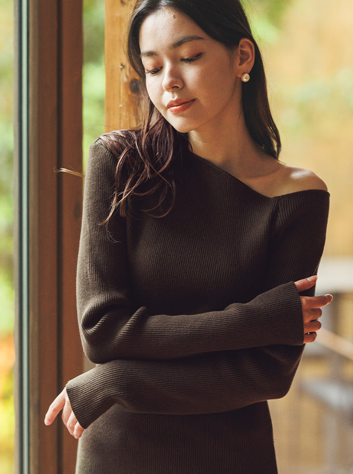 女性らしいネックラインと、ウエストを程よくシェイプしたシルエット。