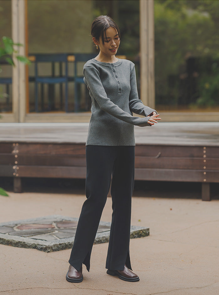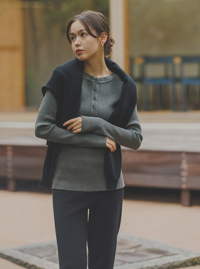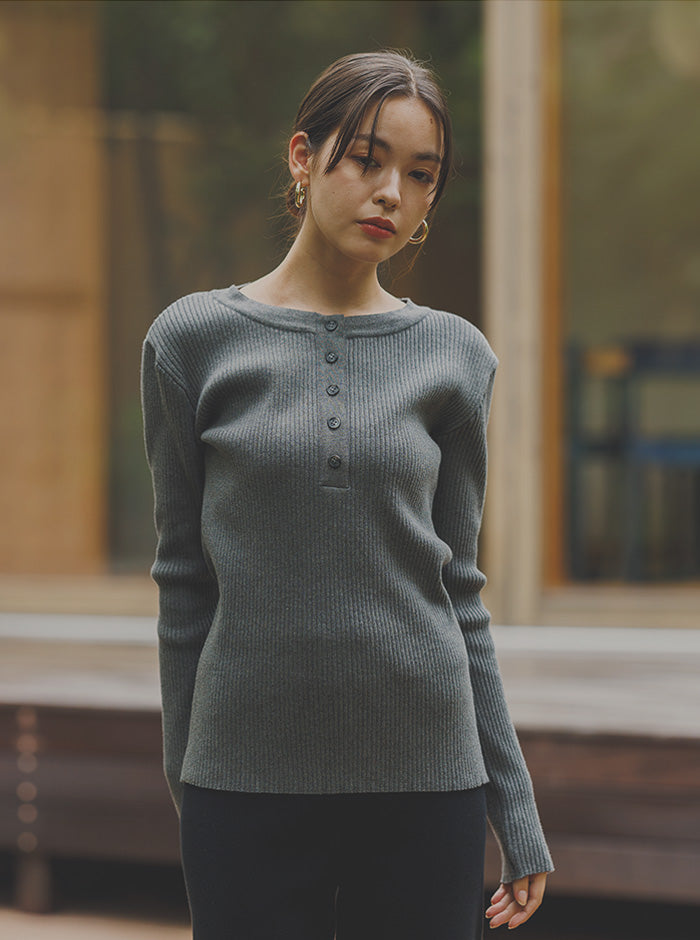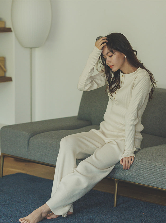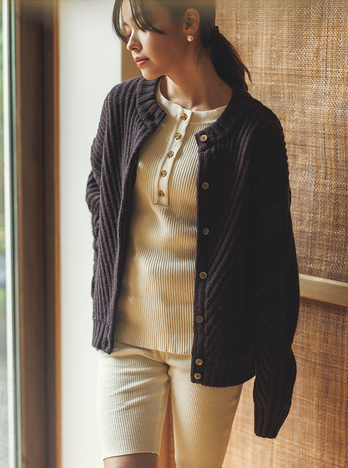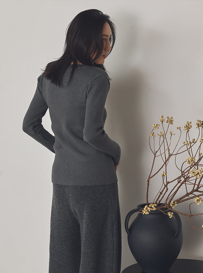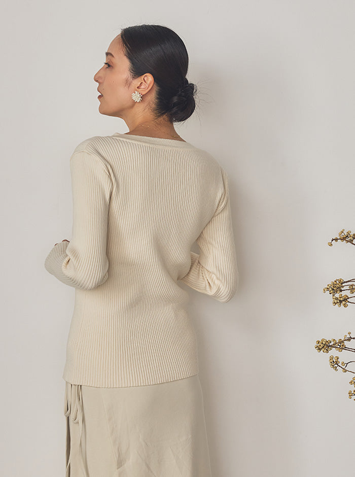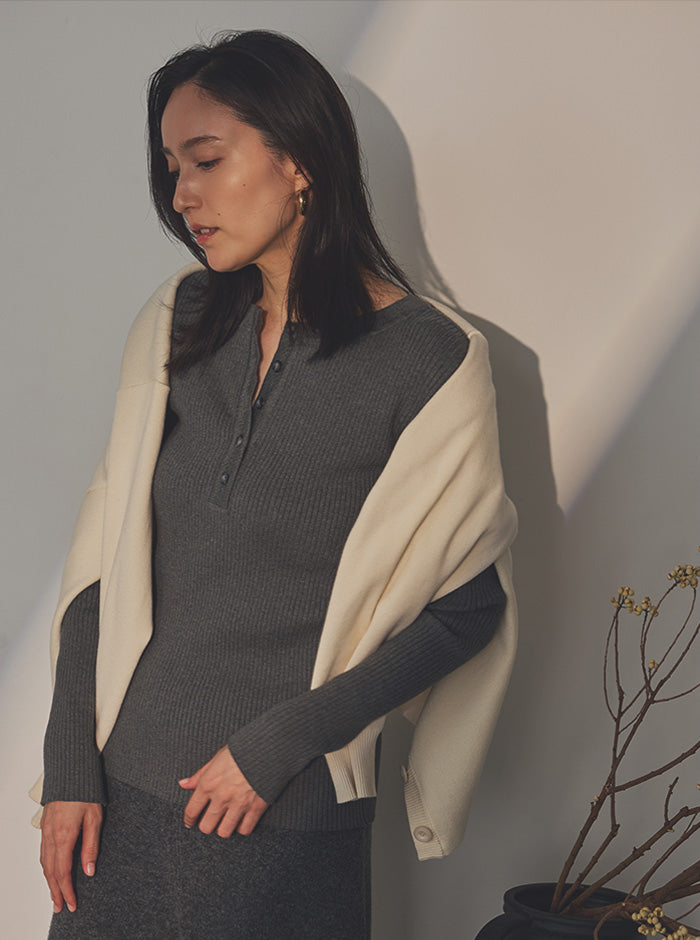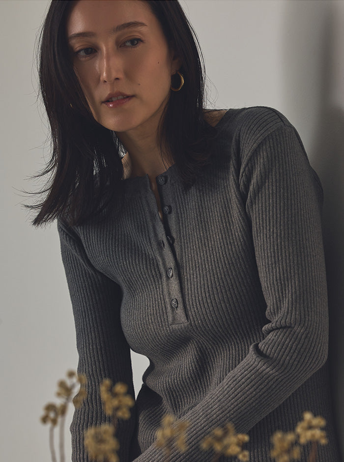 ボディラインを美しく引き立てる細やかなリブ編みは、着る人の動きに寄り添いながらエレガントな陰影を生み出します。