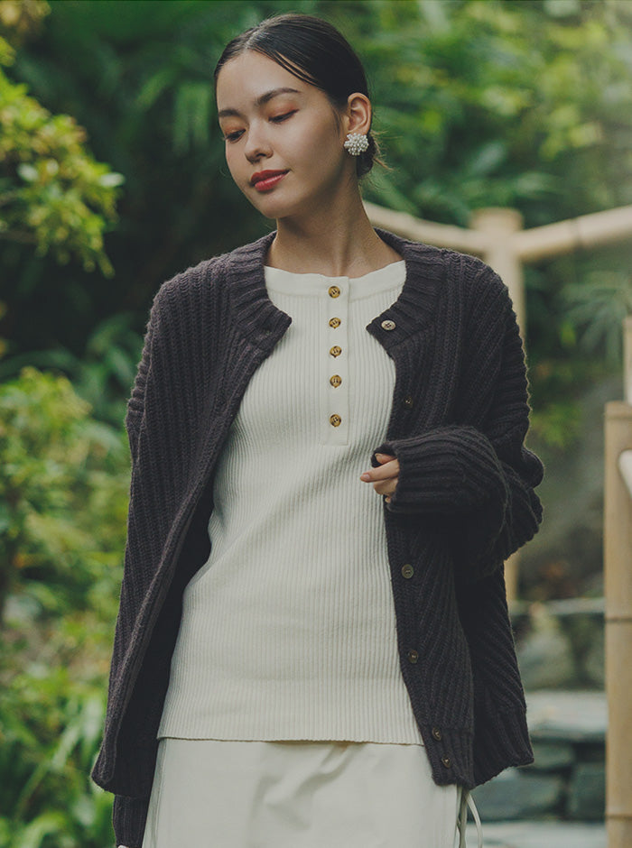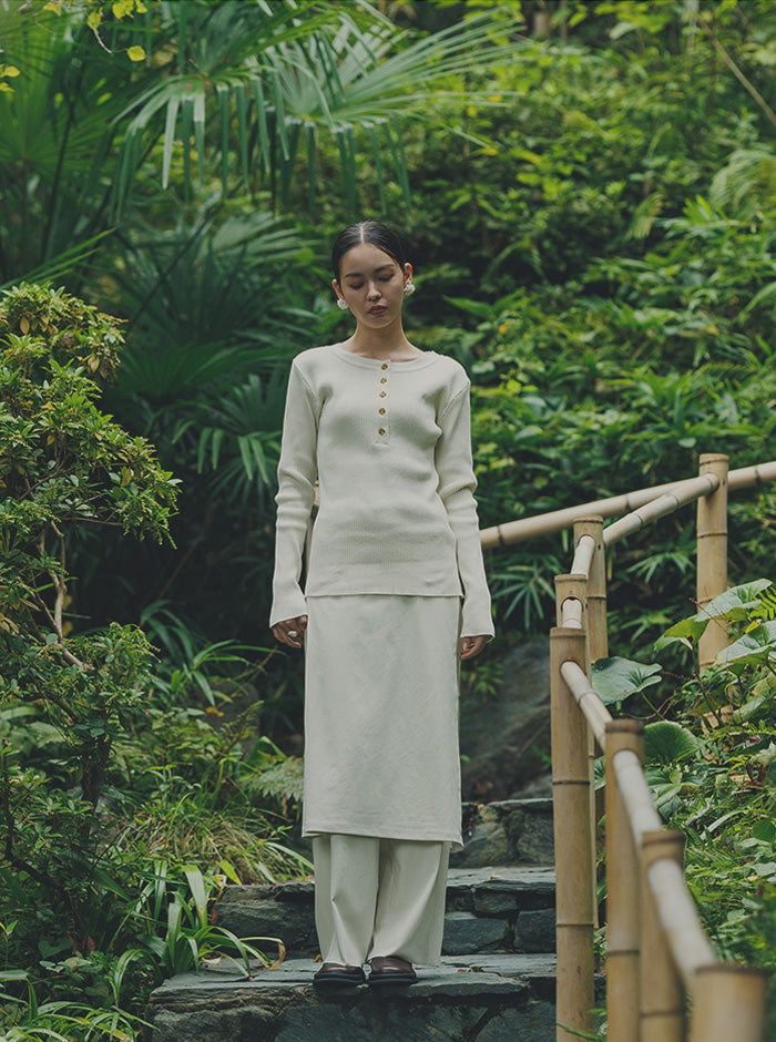 ボタンの配置やネックラインのカーブには、上品さと抜け感のバランスを意識しました。