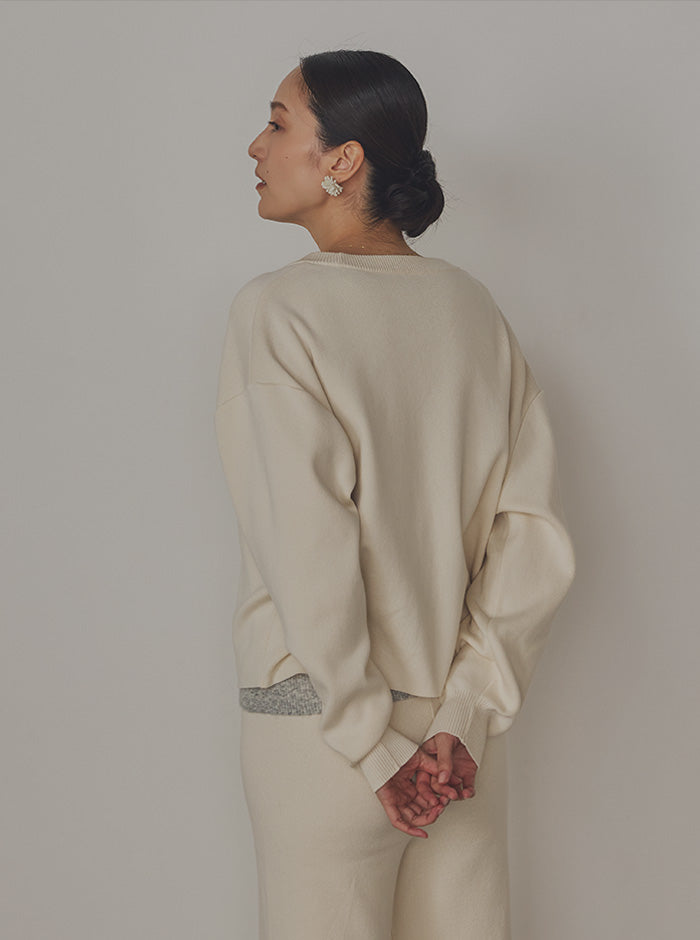 深めのVネックが首もとをすっきりと見せ、自然体の美しさを引き立てます。