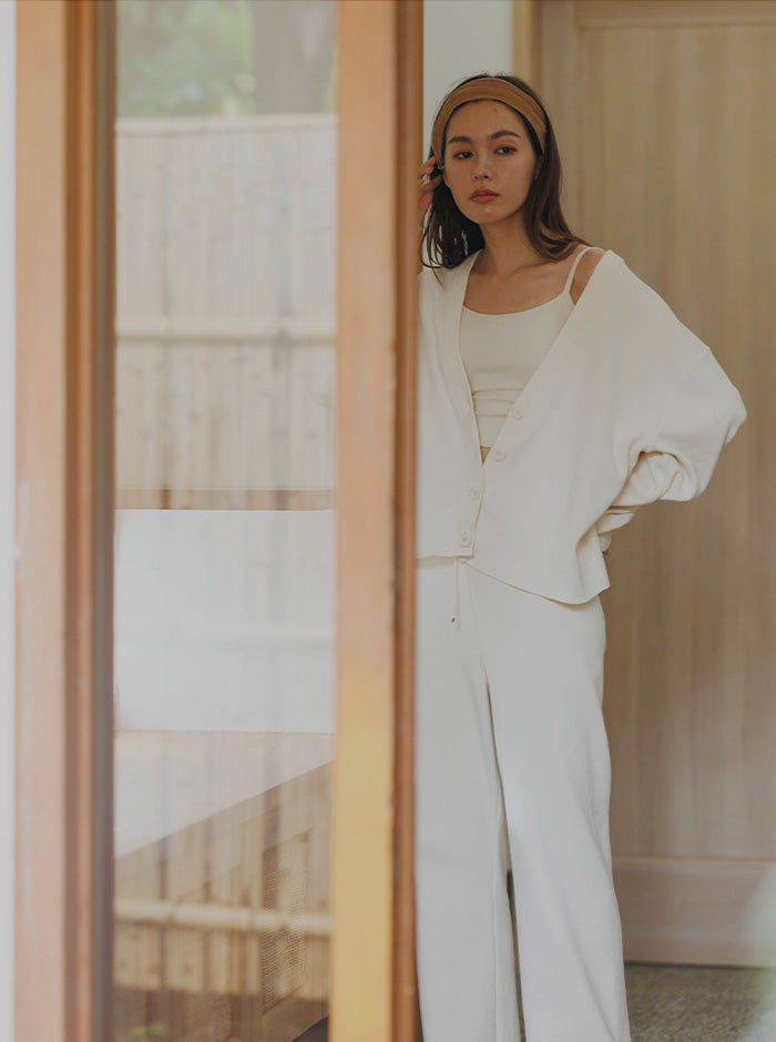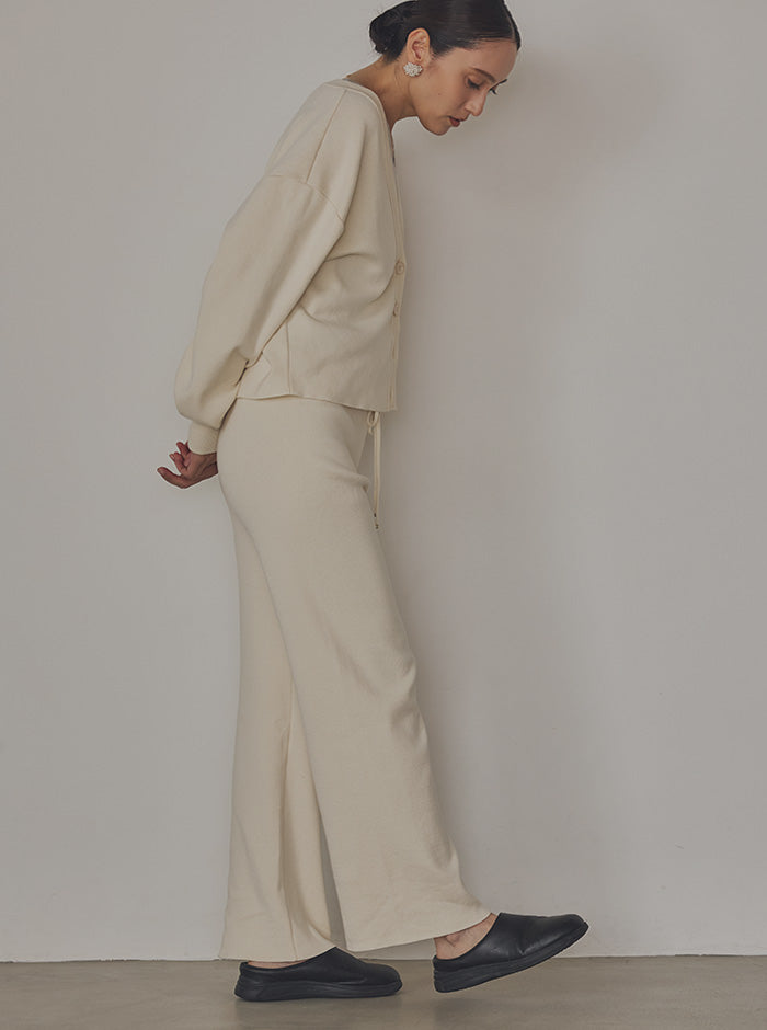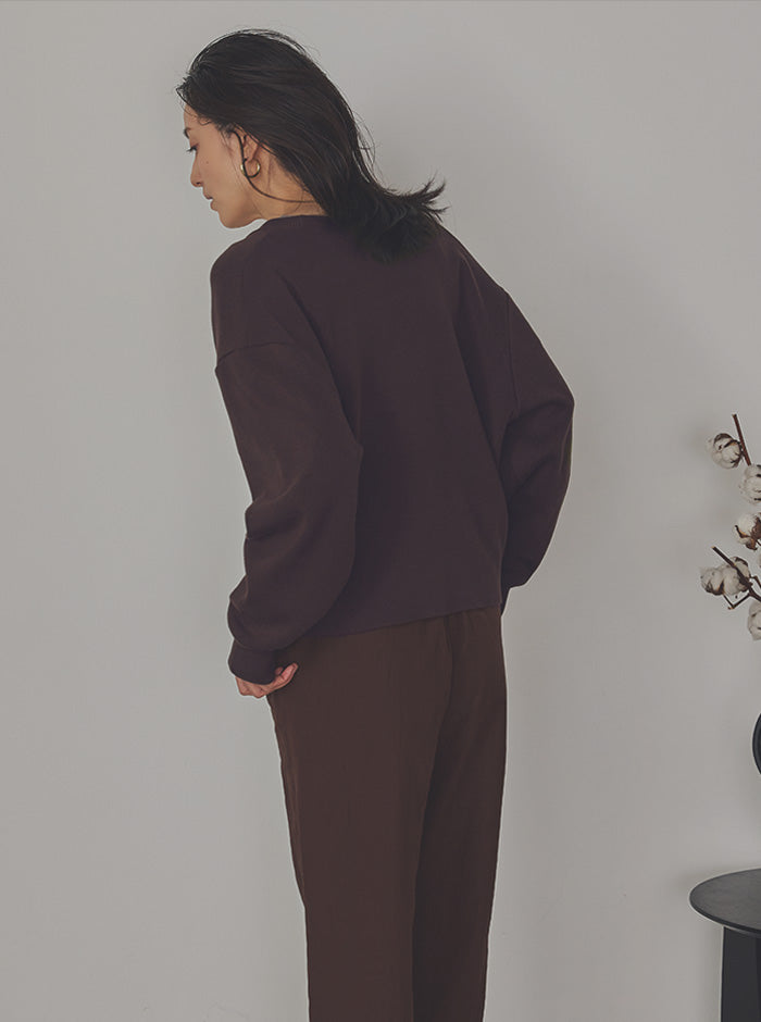 同素材のボトムと合わせて、統一感のある上質なリラクシースタイルを。