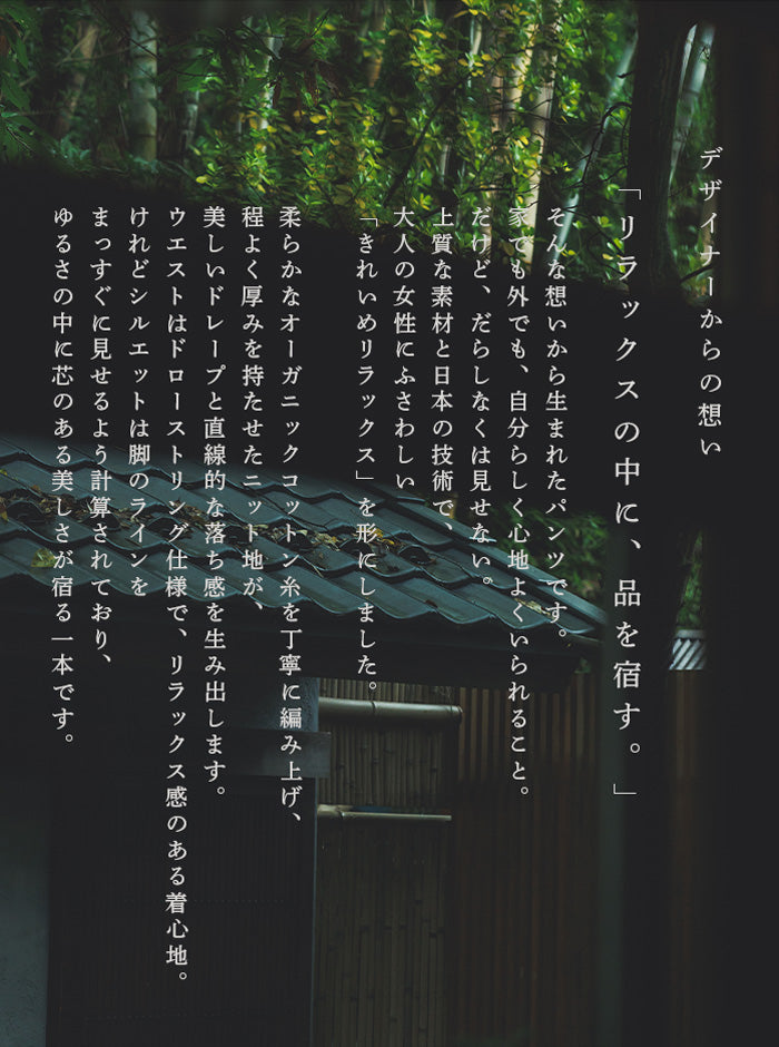 上質な素材と日本の技術で、大人の女性にふさわしい「きれいめリラックス」を形にしました。