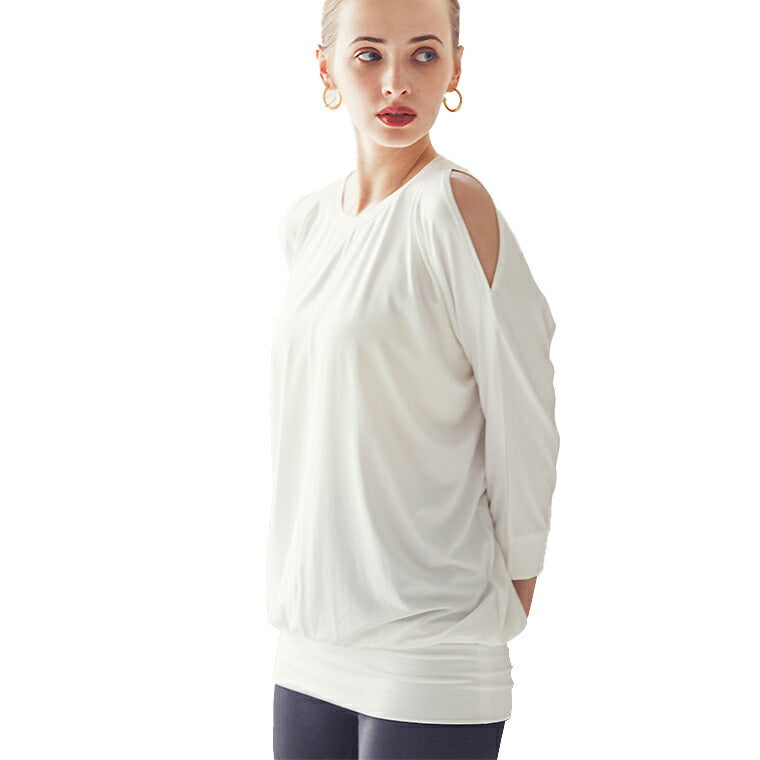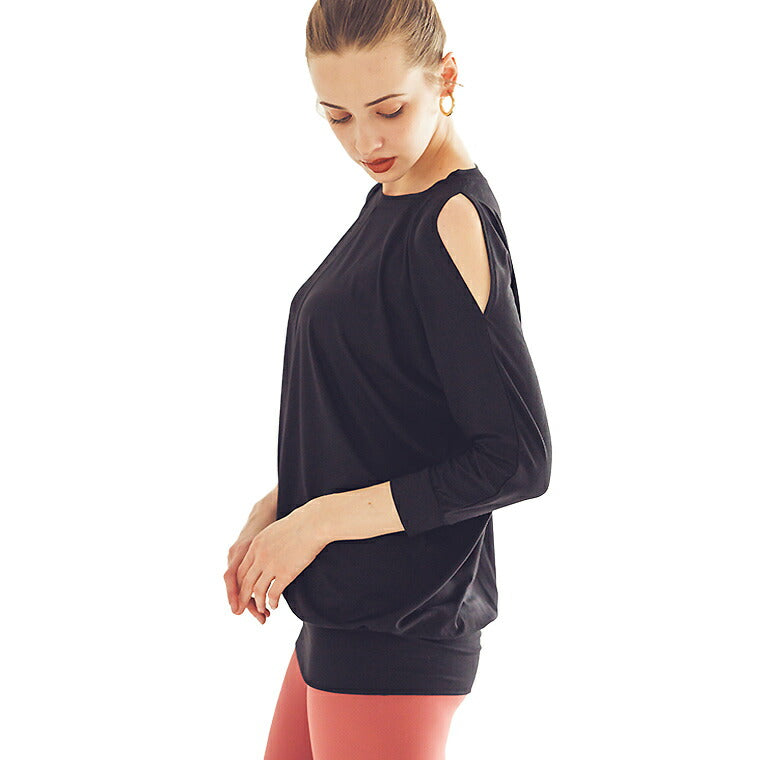 非常に柔らかいタッチで、肌に心地良く馴染む風合いが魅力的。また、ストレッチにも優れ、優しく身体を包み込んでくれるリラクシーな一枚に仕上がっています。背中が控えめにオープンになったヘルシーなデザインが好評。長めの丈がヒップラインをしっかり包み込み安心感をプラス。素材は優れたストレッチ性・速乾性の高機能性と、さらっとした肌触りを併せ持つ素材を使用しています