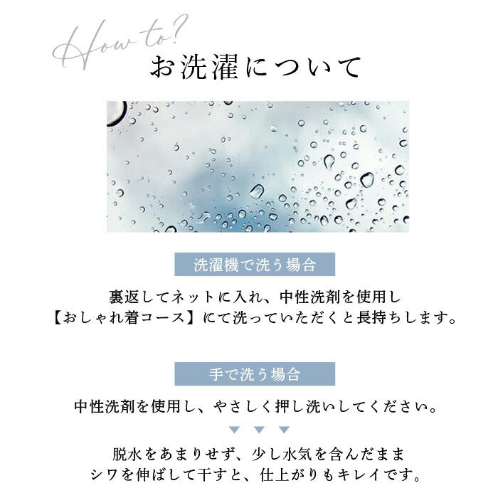 ・素材の特性上、お洗濯の際水に濡れると1-2cm程の若干の縮みがありますが、着用することで生地が馴染み元に戻りますこと、 予めご了承下さい。