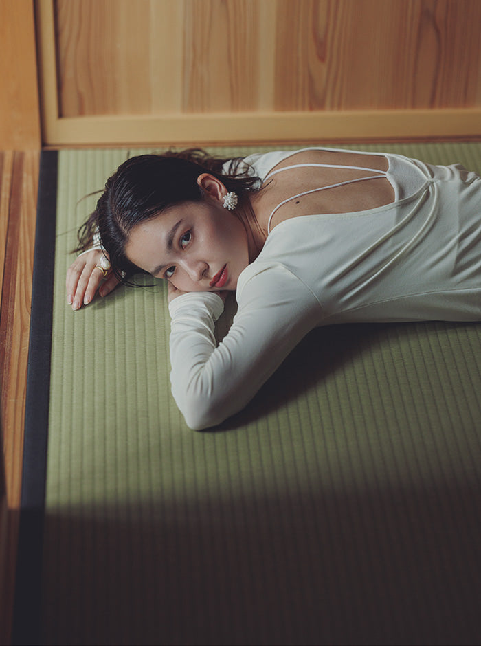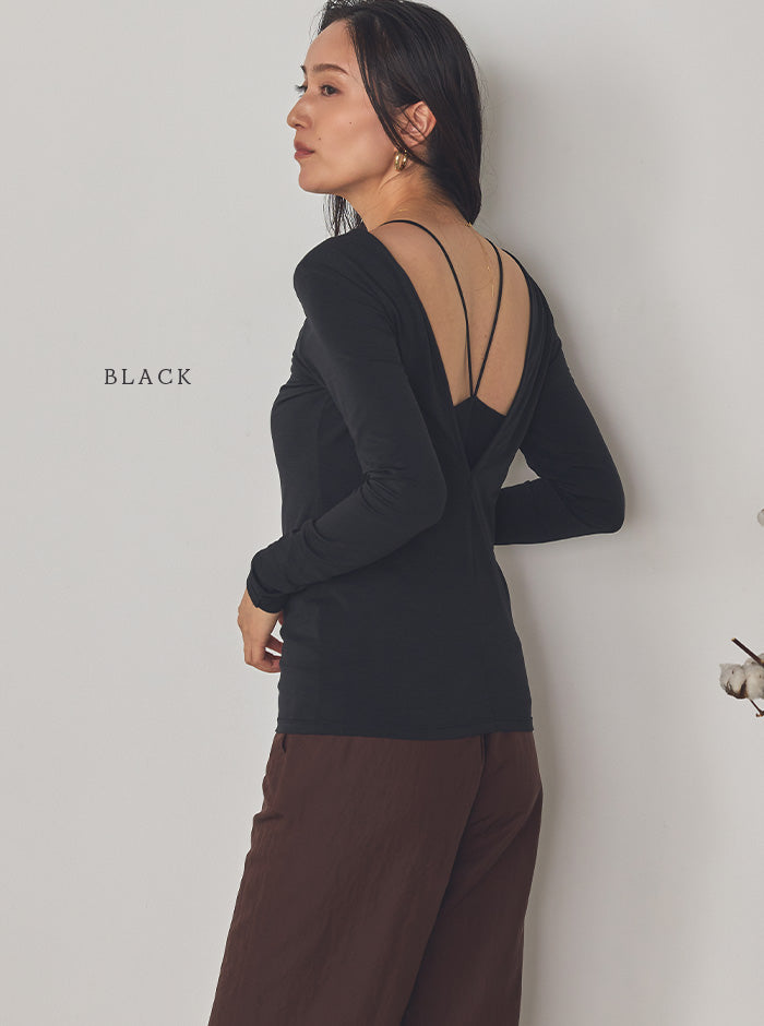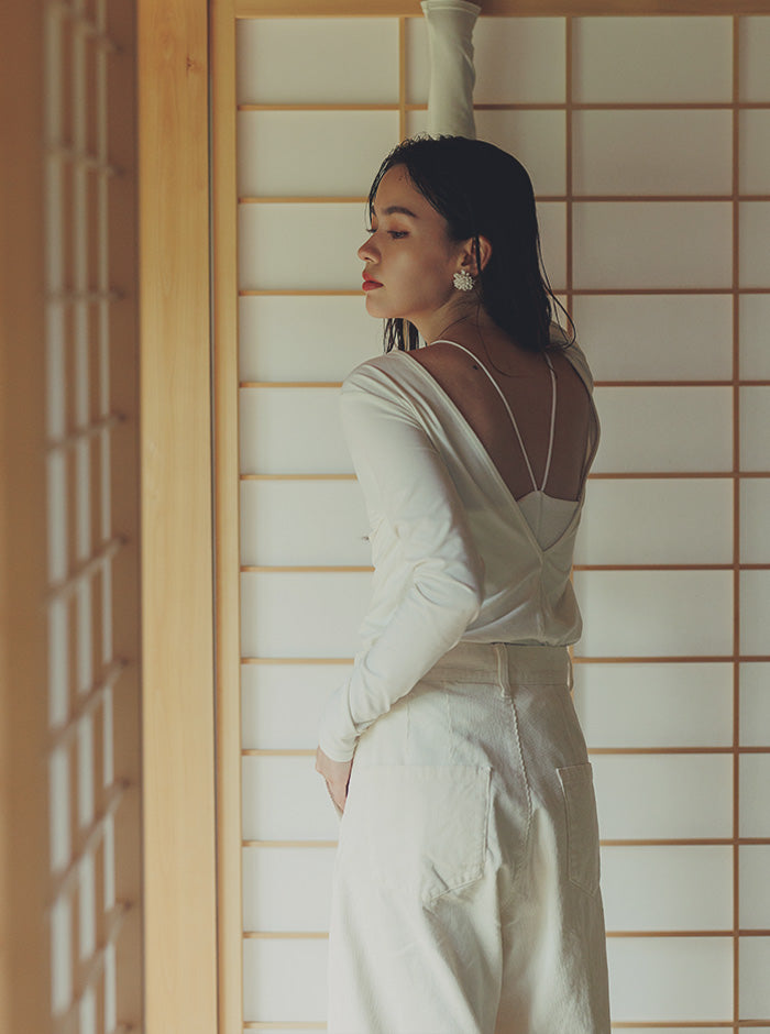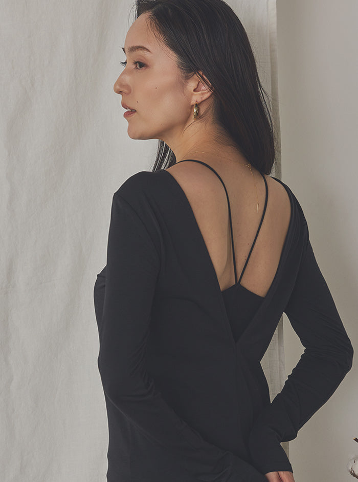 インナーとのレイヤードを楽しめる開放的な背中のカッティングは、ヘルシーな色気を漂わせます。