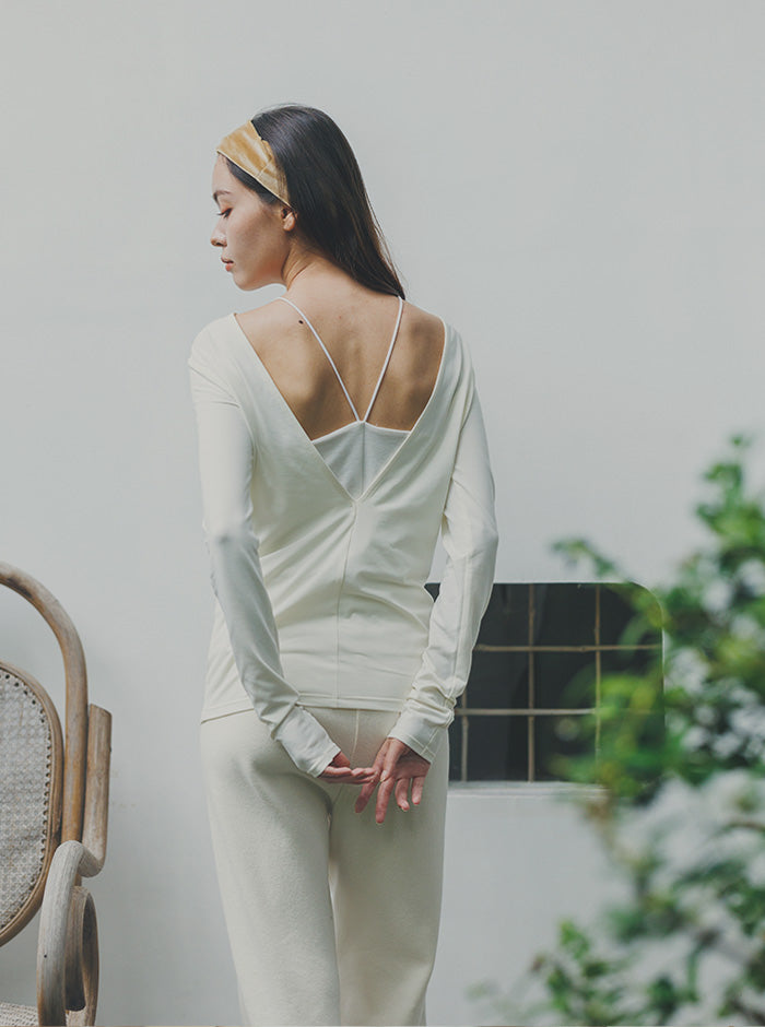 また、長袖でありながらバックオープンデザインで通気性が良く、寒い時期のウォーミングアップはもちろん、ホットヨガや夏の冷房対策にも活躍するオールシーズン対応の万能トップスです。