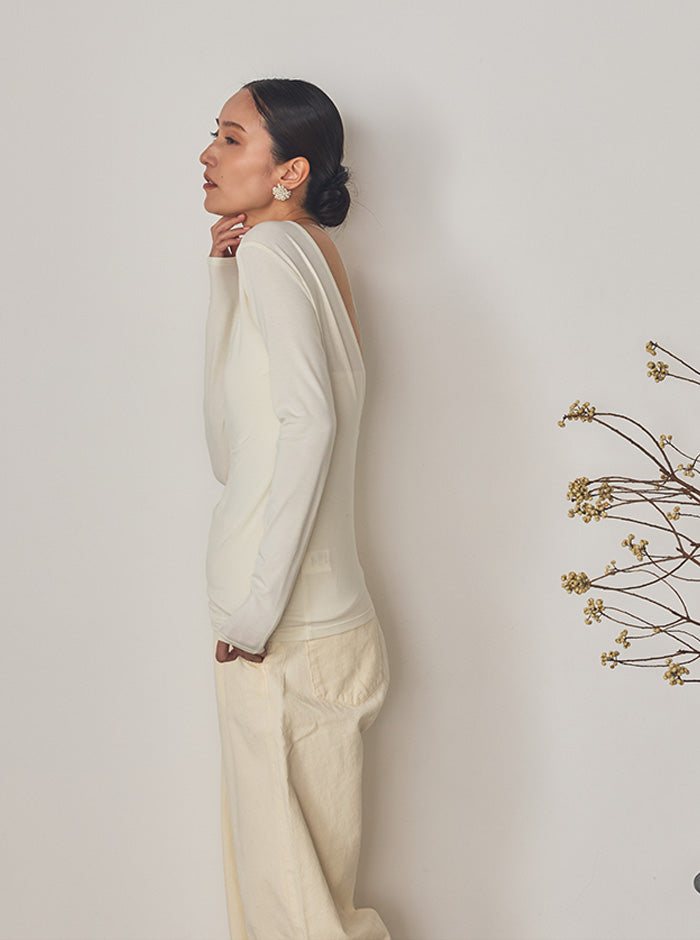 深すぎない絶妙な開きが、背中のラインを自然に美しく演出。