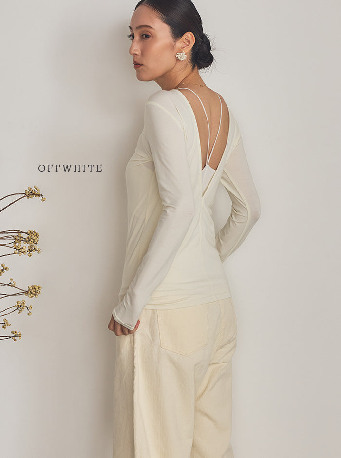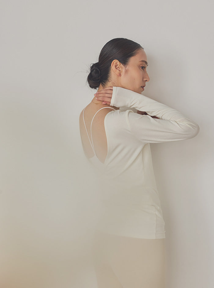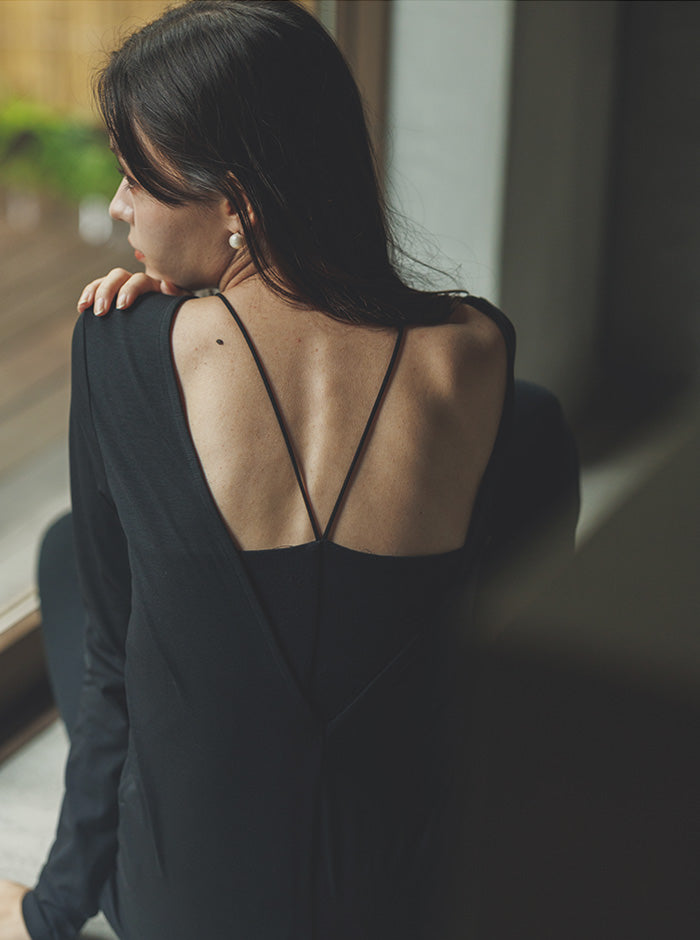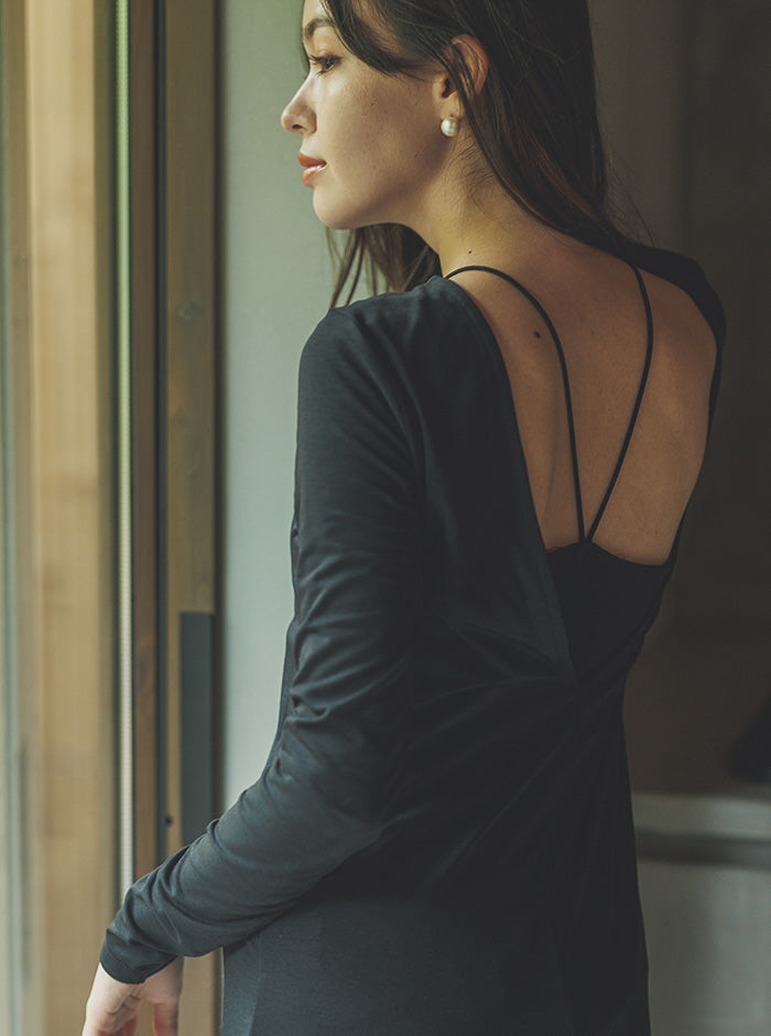 深めのVラインは、背中をすっきりと見せると同時に、インナーやストラップとのレイヤードを楽しめるよう計算されています。