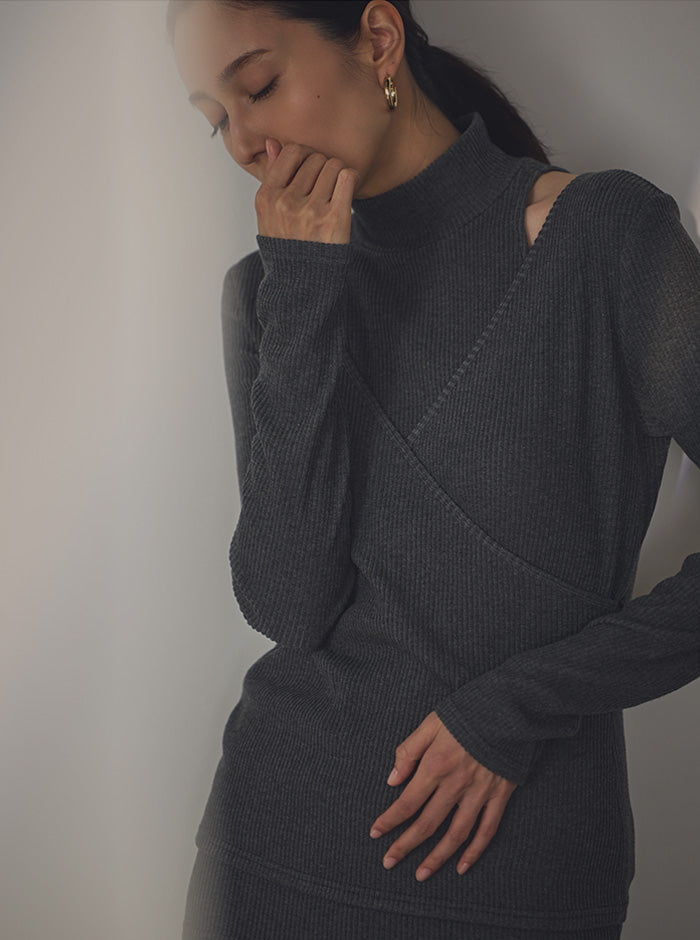 繊細に編み上げられたリブ地が縦のラインを美しく強調し、すっきりとしたモードな印象を描き出します。