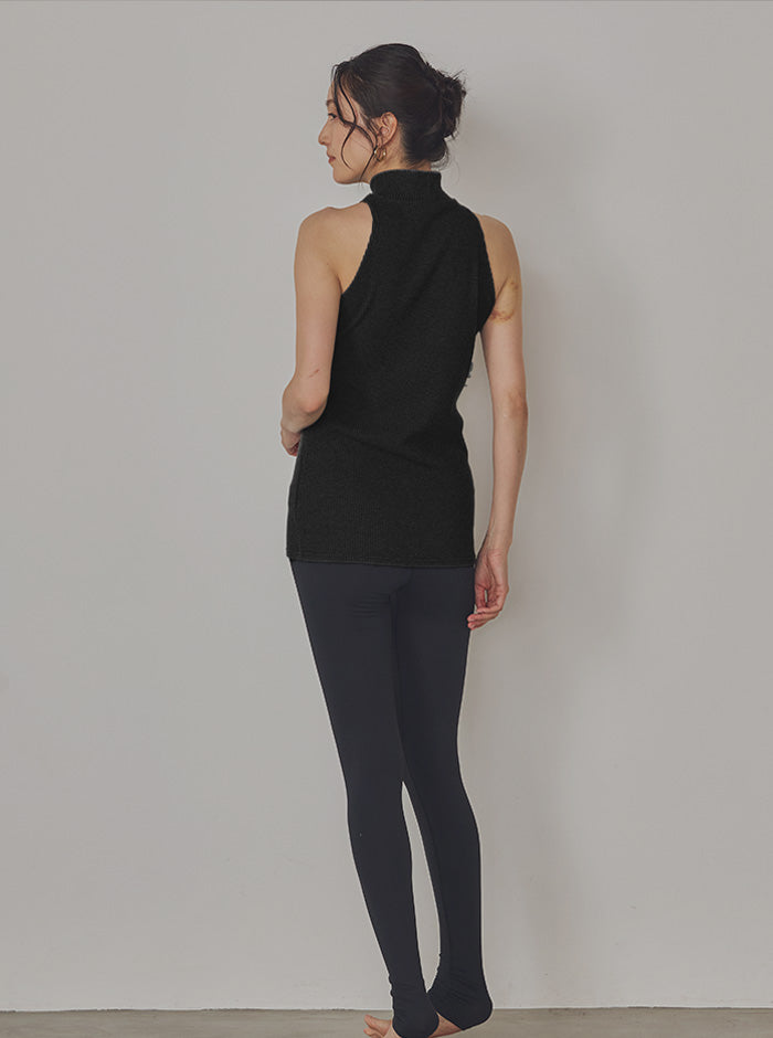 肩を美しく見せるホルターネック風のカッティングと高めのネックラインが、シンプルながらもモードで大人っぽい印象に。