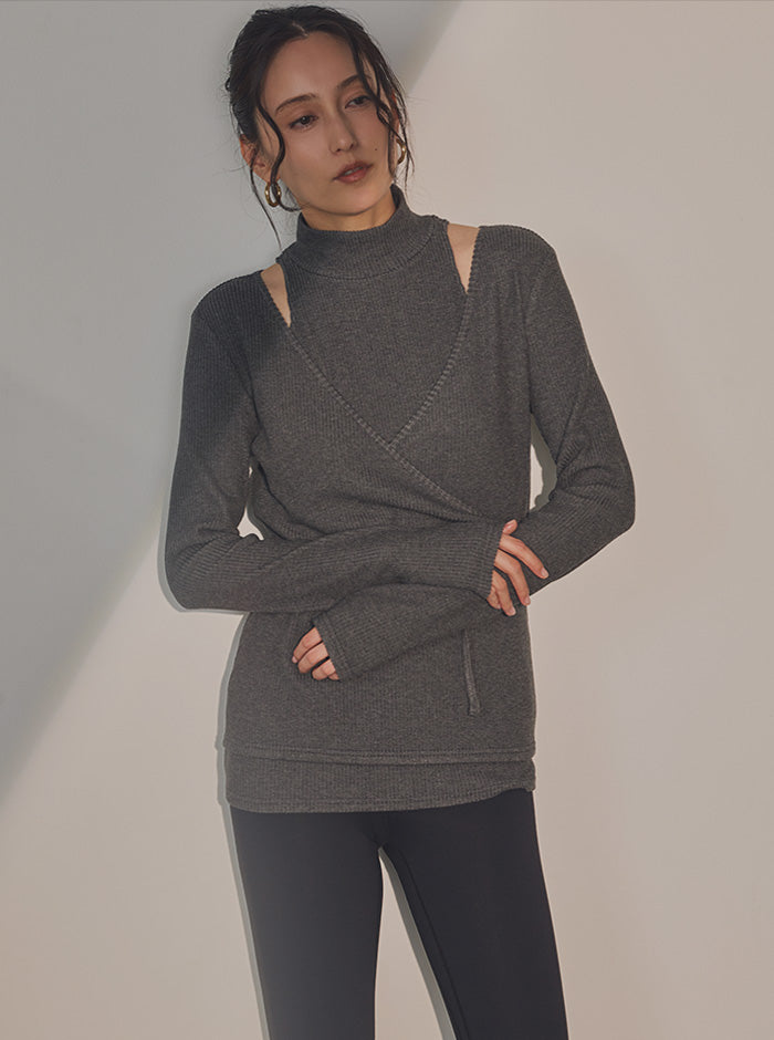肩の抜け感と、首元を包み込むようなハイネックのバランス。