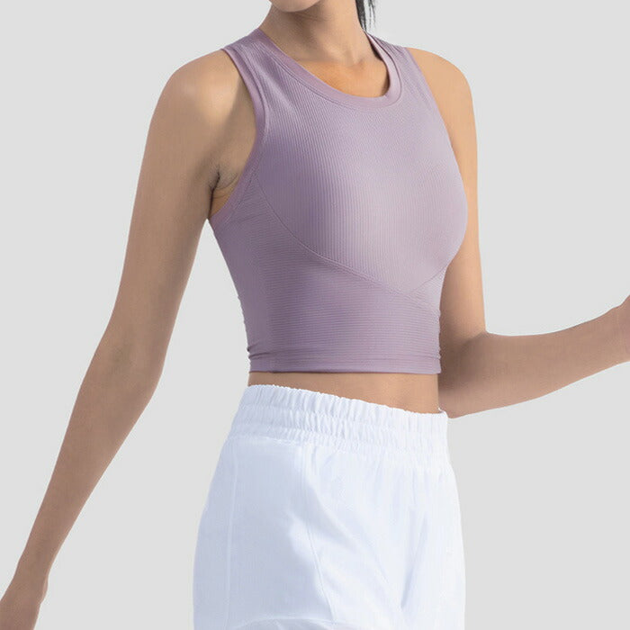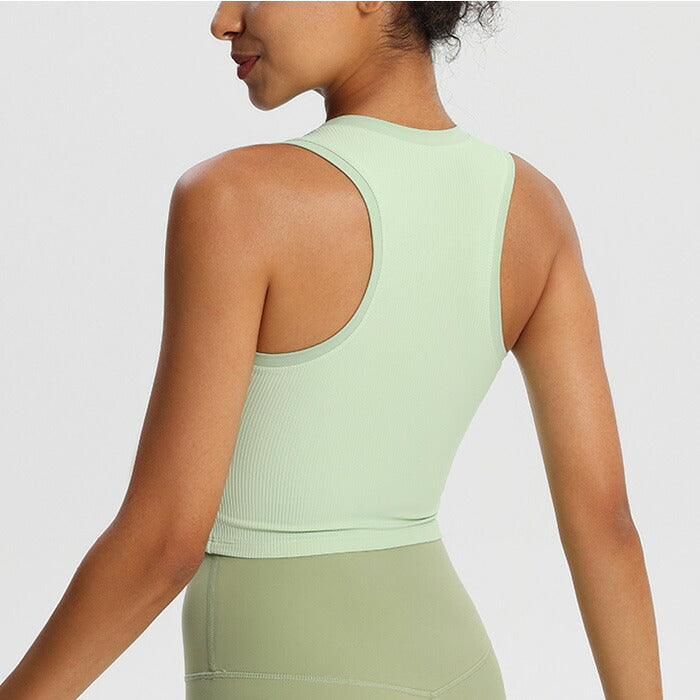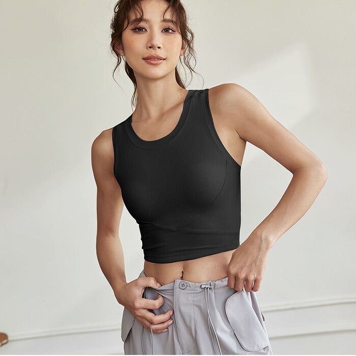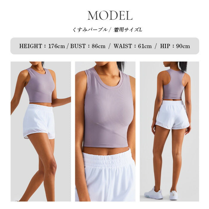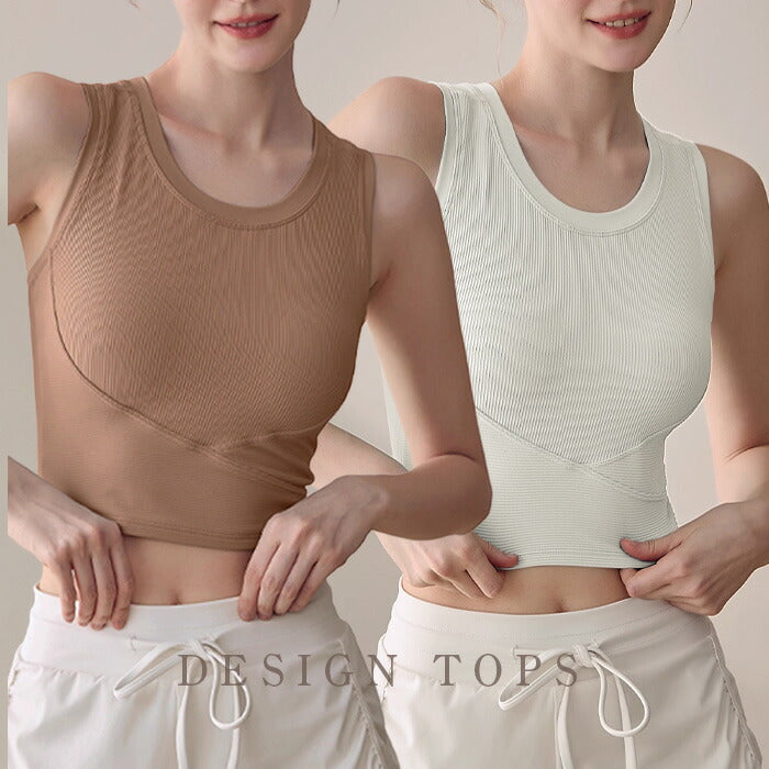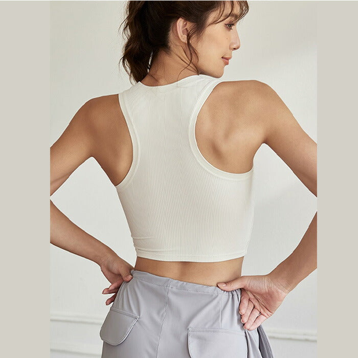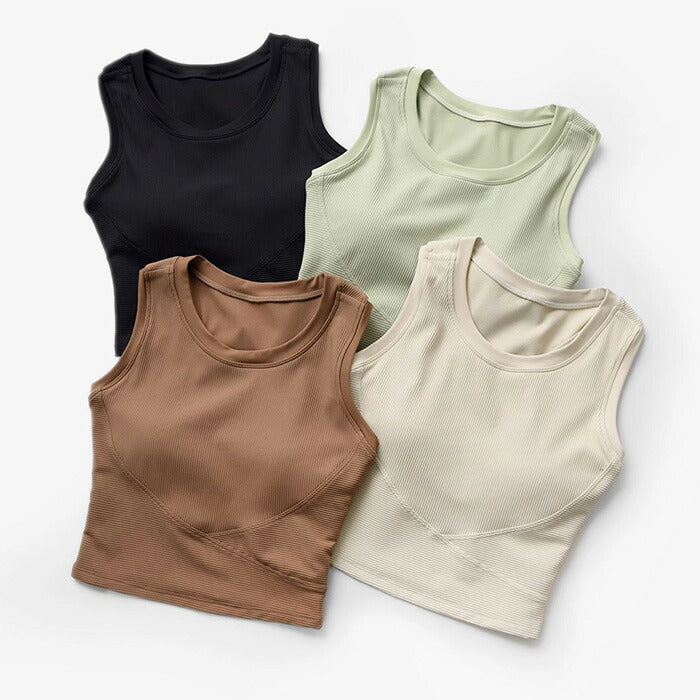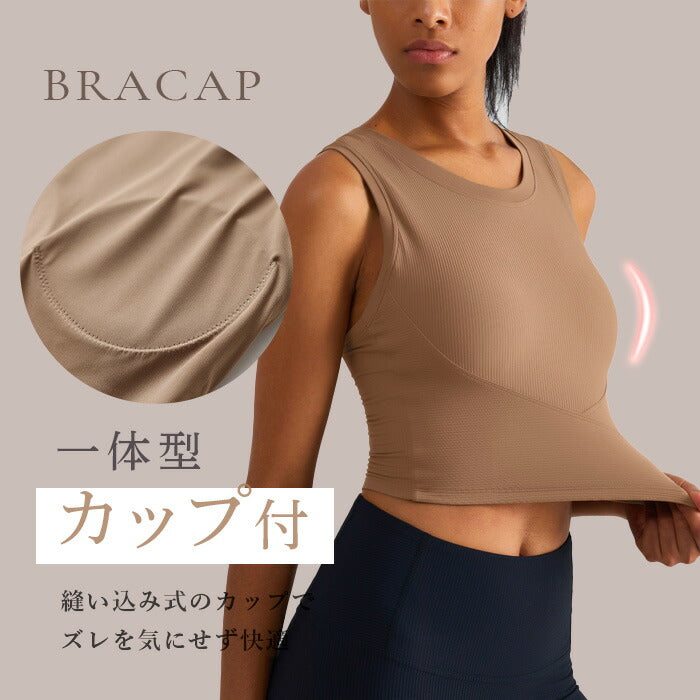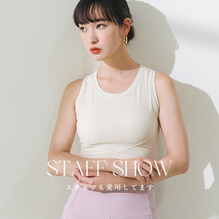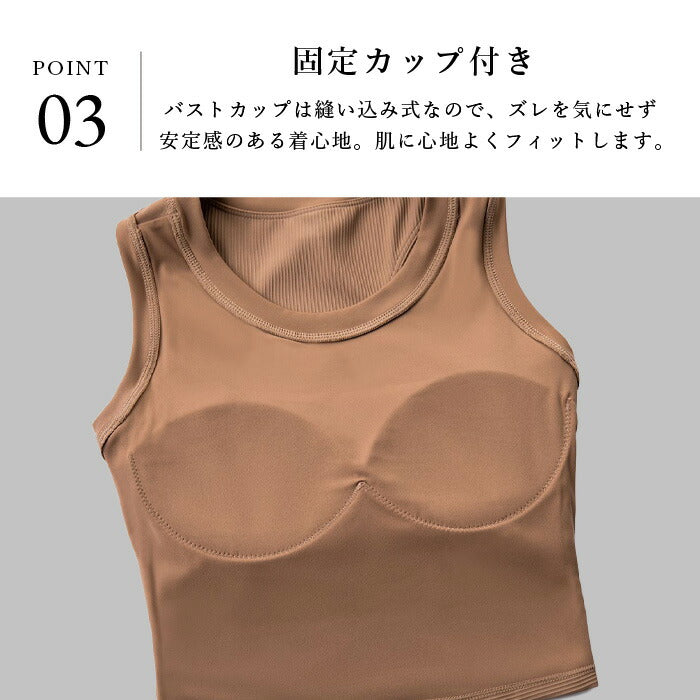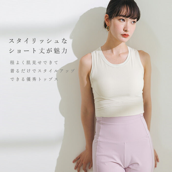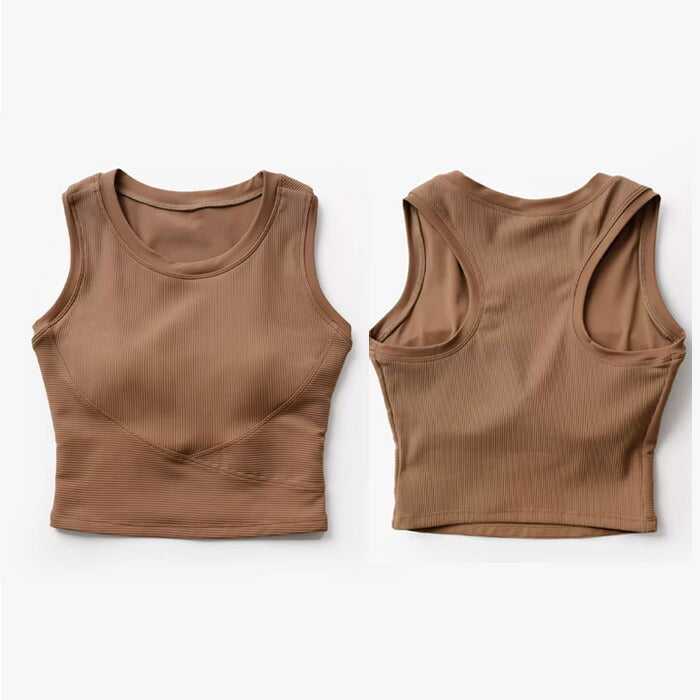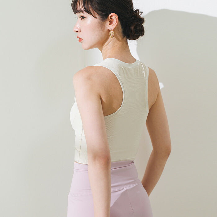 スポーティな雰囲気の中に、レースアップの背中デザインで女性らしい魅力をプラスしたブラカップ付きのタンクトップです。