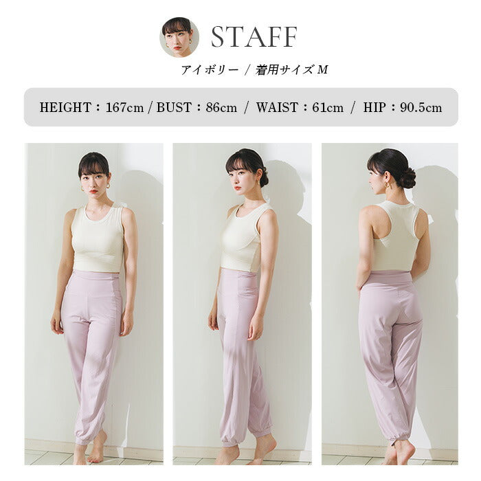 吸水速乾・消臭素材を用いており、ナイロンベースなのでホットヨガなど汗を多くかくエクササイズにぴったり。