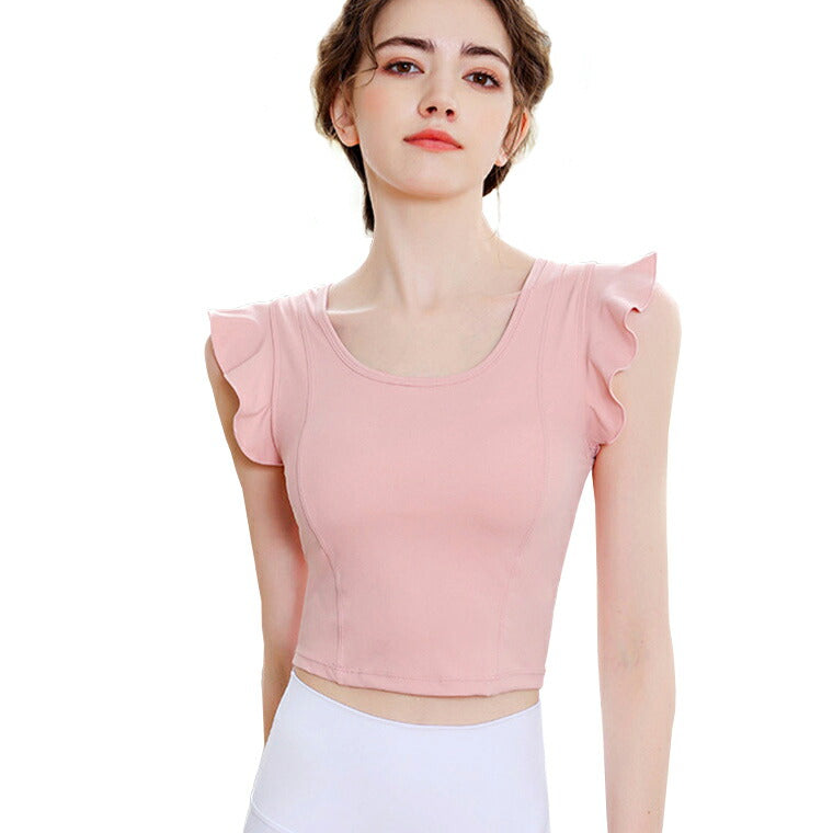 しっかりフィットする首まわりでしゃがんでも胸元が気にならない。程よい肌見せで美しいウエストラインを叶えてくれるハーフ丈カップ付きトップスです。