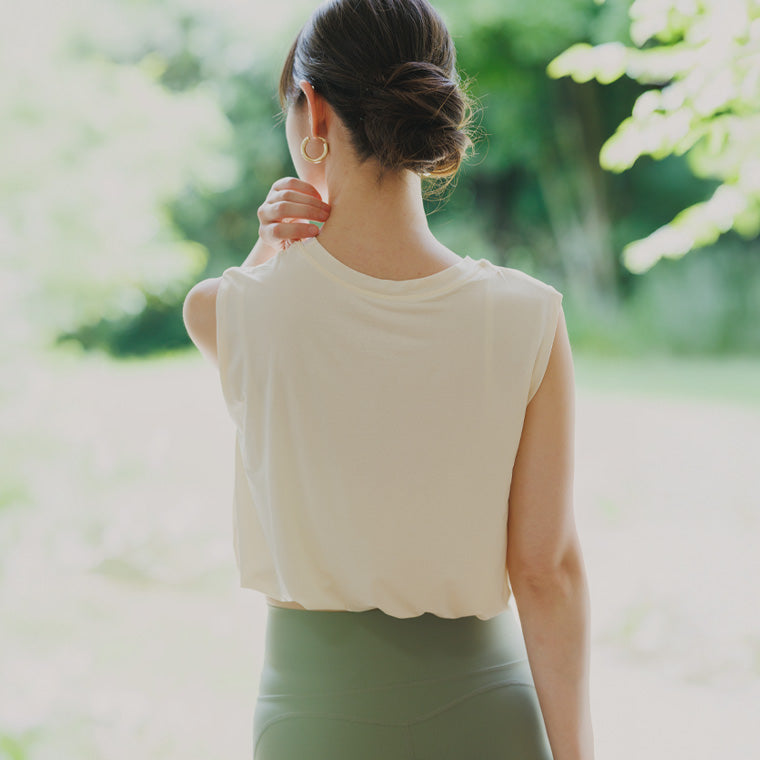 肩先が少し隠れるスリットスリーブが肩の張りをさりげなくカバーしつつ腕を細く見せてくれます。