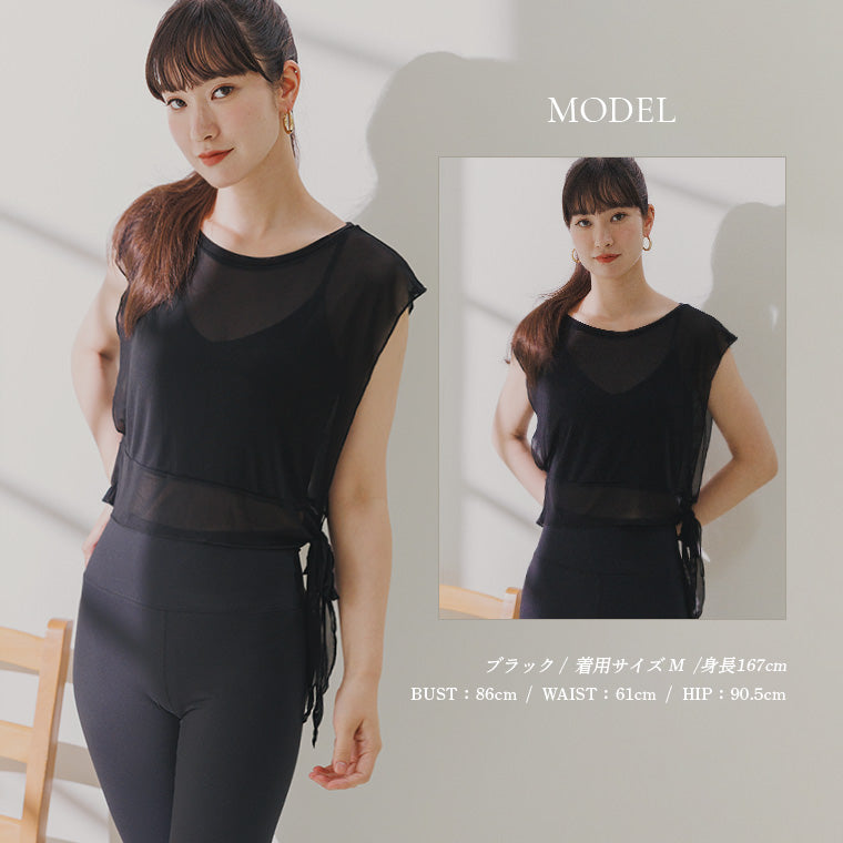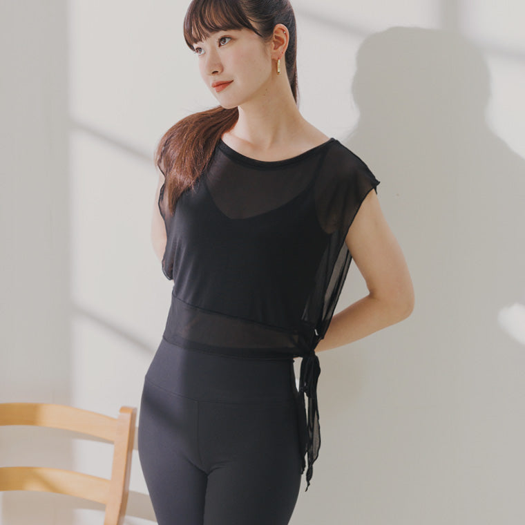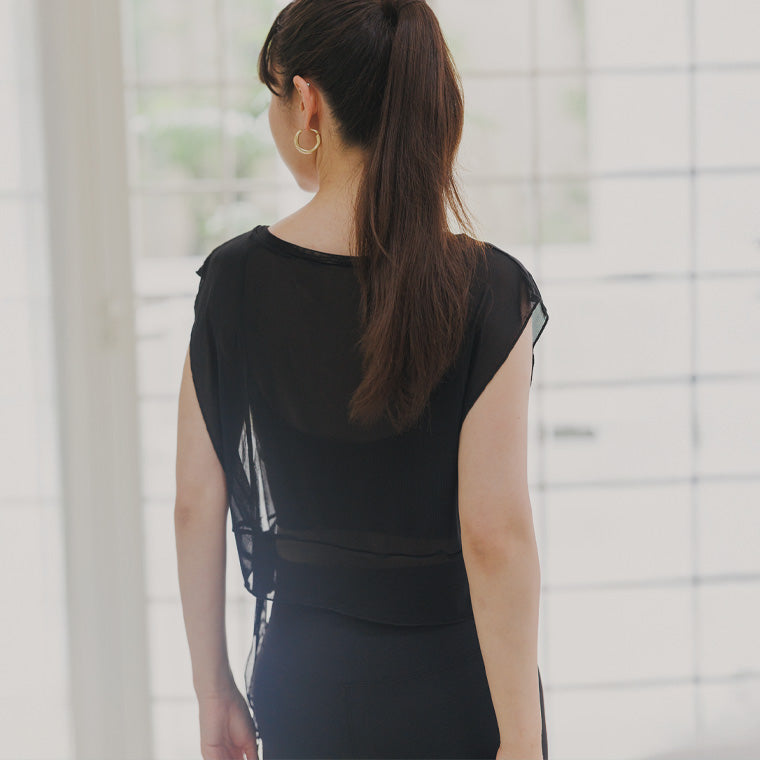 ブラトップやタンクトップの上に重ねるだけでイメージチェンジができるフェミニンなメッシュTシャツ