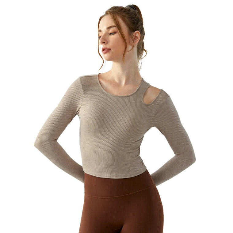 程よい肌見せができるアシンメトリーデザイン。伸縮性抜群のリブ生地が身体にフィットし美しいボディラインを演出するストレスフリーな着心地のカップ付き長袖トップスです。